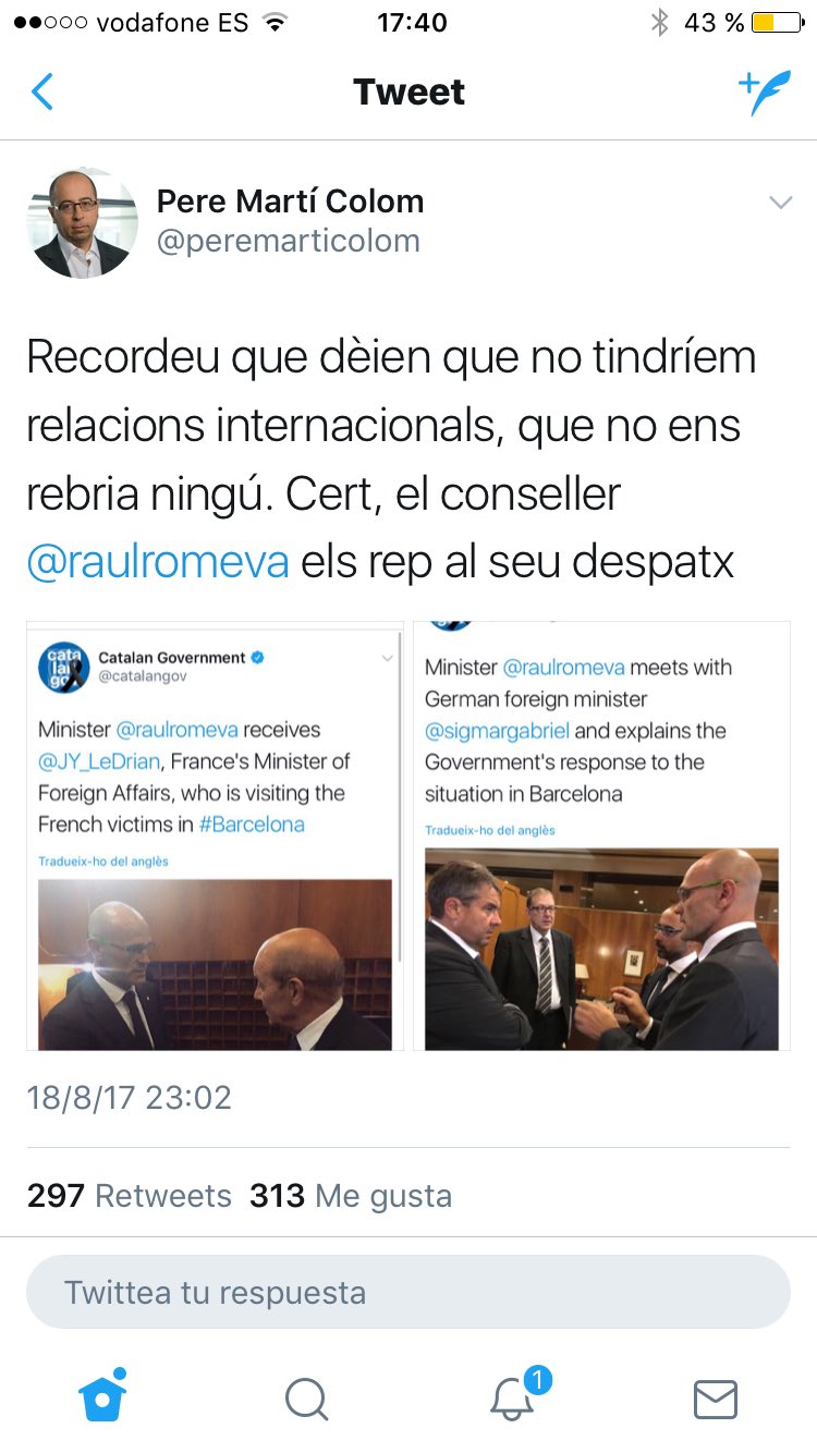 Y francamente, me la suda, como se dice vulgarmente, pero después que no vendan la moto que no se está instrumentalizando nada. Desde el minuto uno se está aprovechando este miserable atentado para dar publicidad de forma enmascarada. Eso no tiene perdón de Dios. Si al presidente del gobierno se le icurre dar la rueda de prensa solamente con la bandera de España de fondo, no me imagino la que se habría montado. Y sin embargo no he visto a nadie criticar lo contrario. Muy bien hecho por otro lado. Y aunque no debería haber dicho esto, lo hago para que vea las diferentes varas de medir entre administraciones.